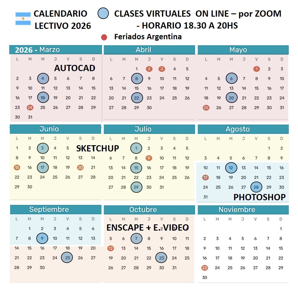 El calendario identifica con CÍRCULO AZUL las fechas de dictado de clases virtuales online correspondientes a cada programa. En color rojo feriados en Argentina.